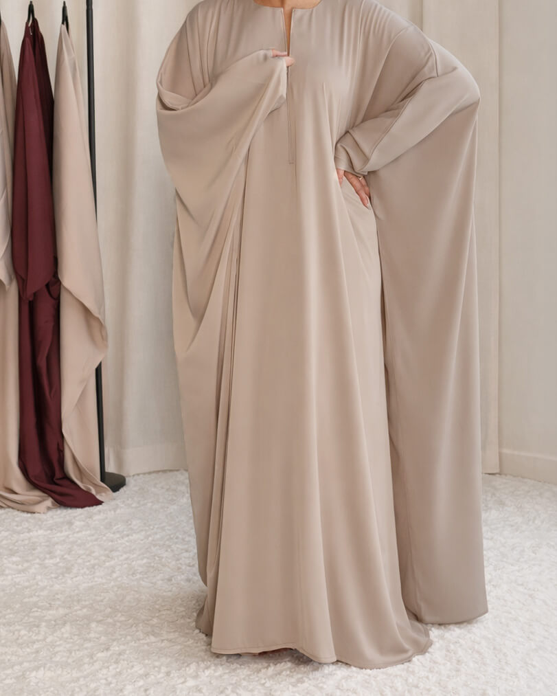 • Fluide, élégante et ultra-pratique, Cette abaya d’allaitement est dotée d’un zip et d’une coupe extra-large façon Bahraini pour un confort absolu.